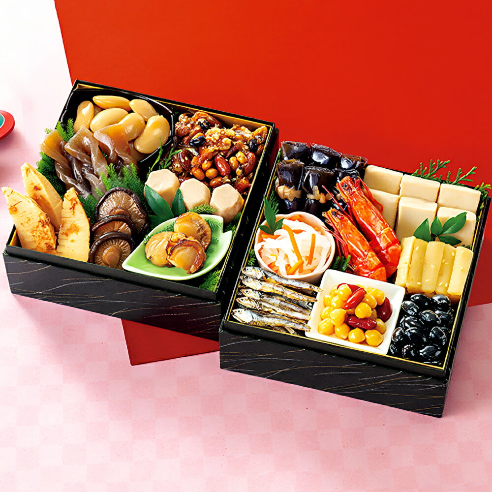 海老、田作り、黒豆、里芋含め煮、にしん一口巻昆布、なます、味付け椎茸、ぜいたく煮、など